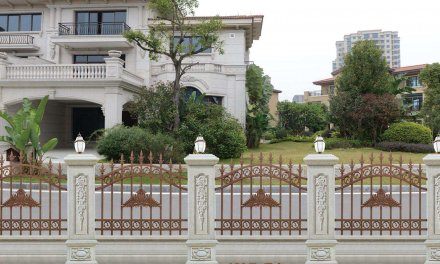 可拆裝,無焊接制作安裝簡(jiǎn)便快捷,采用專利的連接件,大大提高安裝效率。運(yùn)輸便捷,一定程度上節(jié)省了運(yùn)費(fèi)。, 一、門框放入門洞時(shí)必須上下平行左右垂直,如門洞比門框大一公分以上時(shí),必須用石塊或木塊將門框的膨脹螺絲墊實(shí),在門框左上右下先打膨脹螺絲,不要擰緊,羅馬柱的門應(yīng)先裝羅馬柱到門框上,然后再放入門洞。, 為了避免金屬生銹,能夠按期用棉布蘸上少量的防銹油或縫紉機(jī)油擦拭表層局部,堅(jiān)持鐵藝欄桿光亮如新。, 高級(jí)鐵藝制作的表面裝飾效果漆色彩豐富,多采用進(jìn)口漆手繪,既古樸典雅,又時(shí)尚流行.最經(jīng)典的表面裝飾效果漆有青古銅色、紅古銅色、古銅金、黑色、銅金邊、白色金邊等。, 1、造價(jià)比較實(shí)會(huì)。